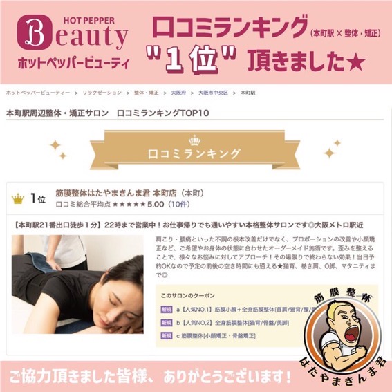 口コミランキング1位は本当にすごいです。それだけお客様を施術している数が多いのと評価が高い証ですからね。